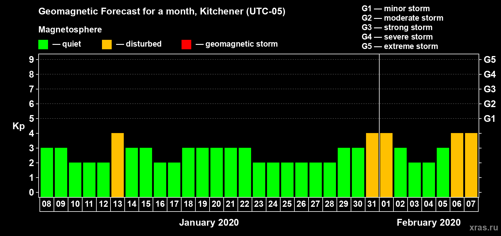 Geomagnetic storm forecast in Kitchener for Jan 08, 2020