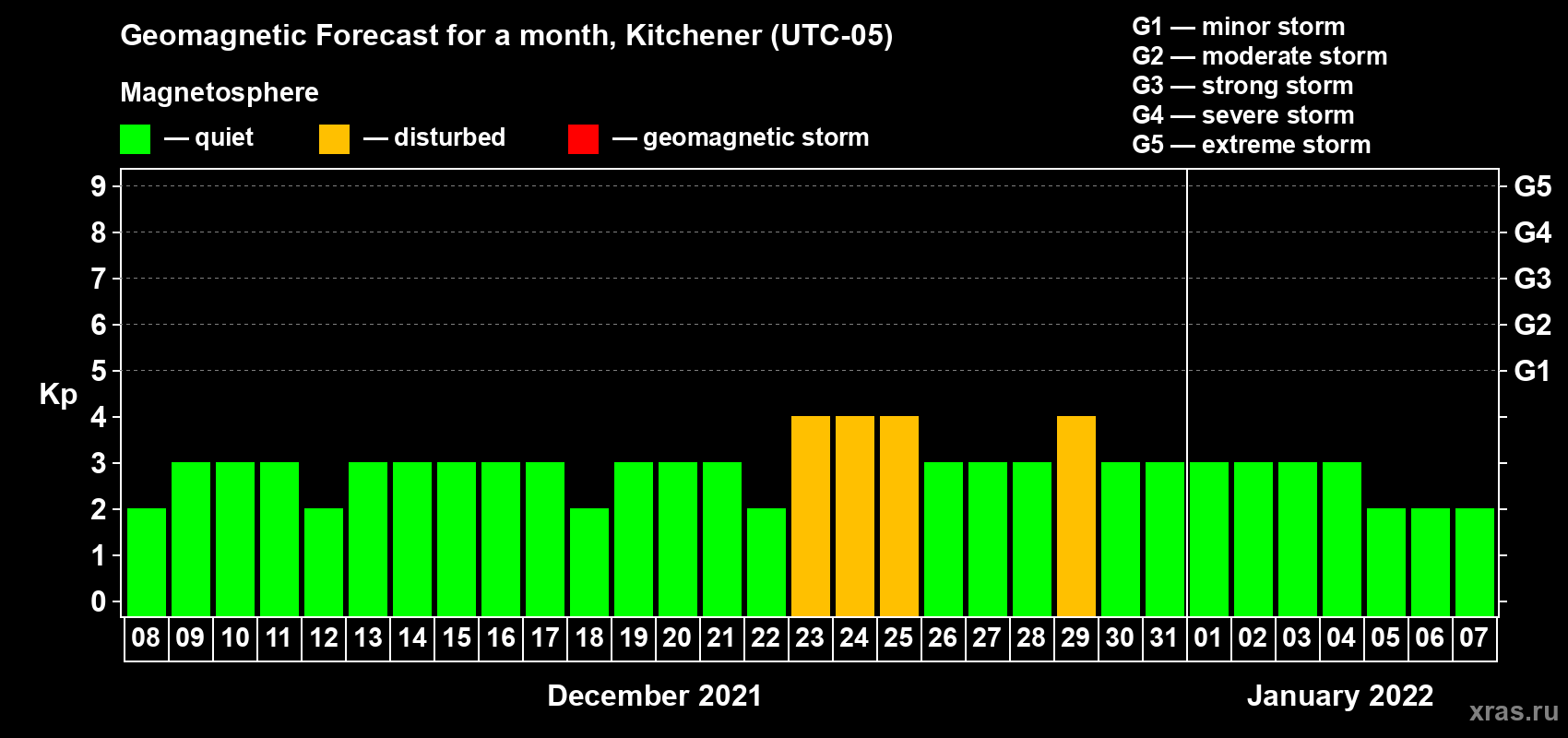 Geomagnetic storm forecast in Kitchener for Dec 08, 2021
