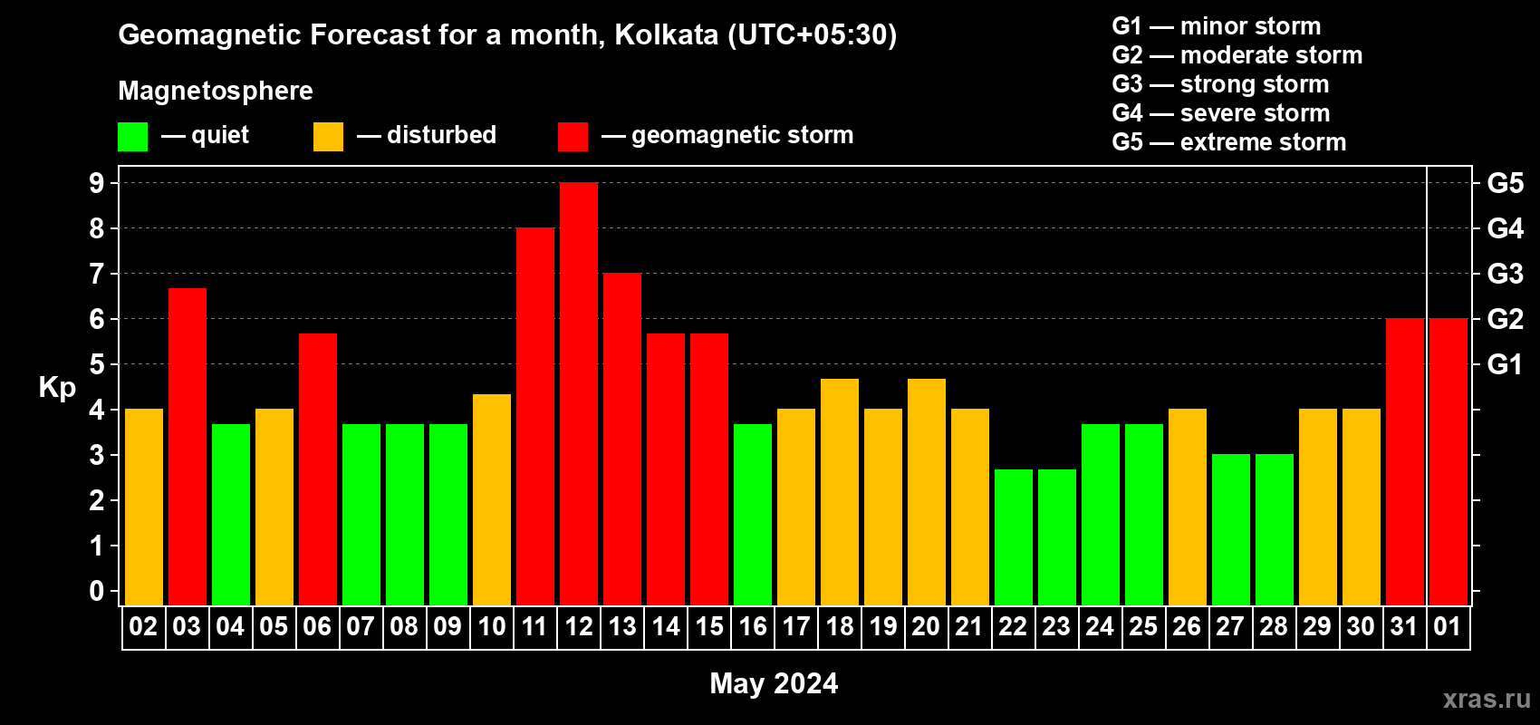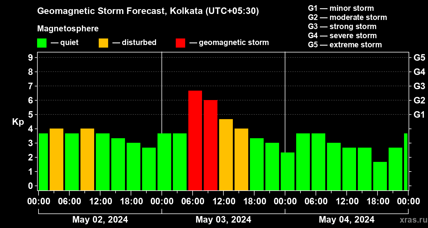 Geomagnetic storm forecast in Kolkata for May 02, 2024