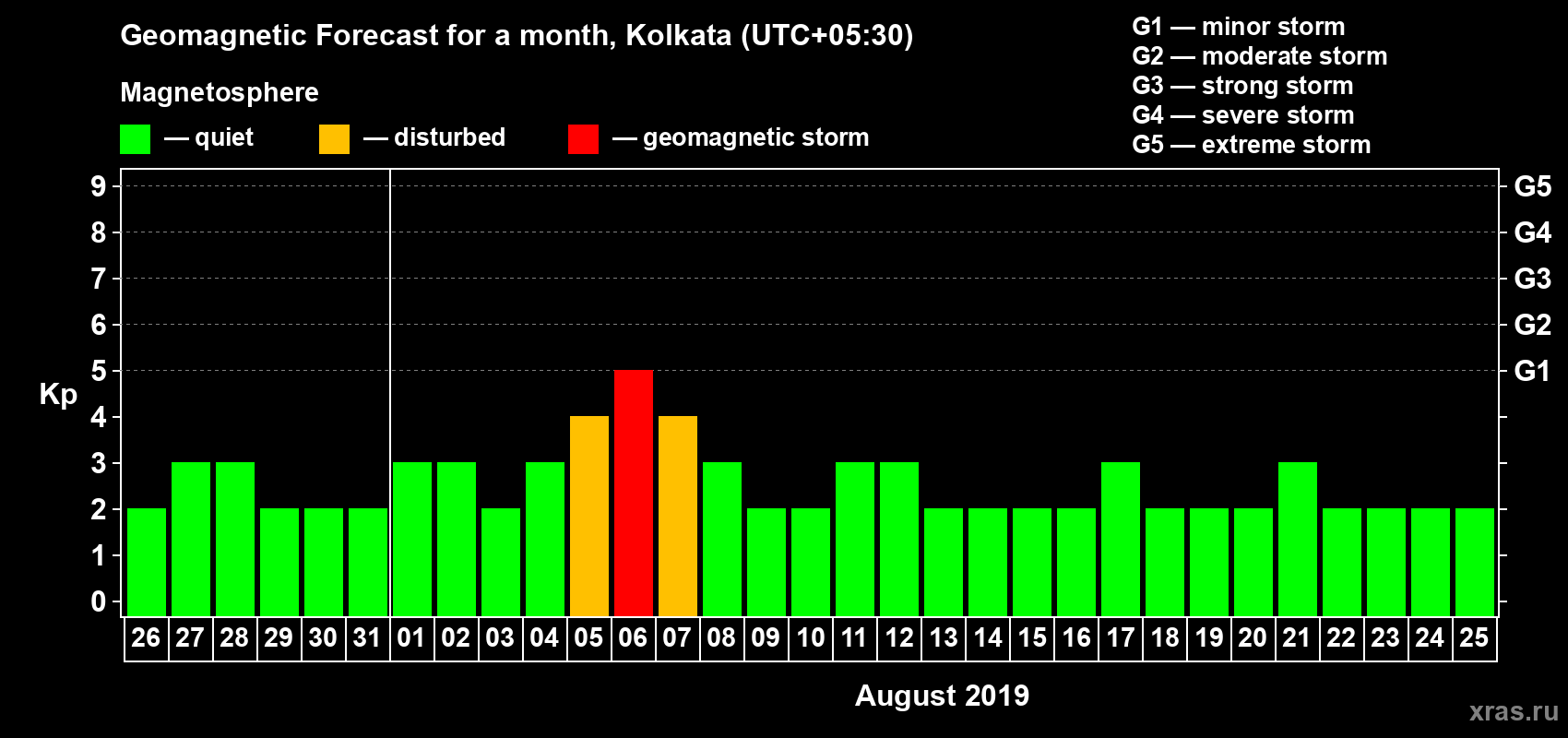 Geomagnetic storm forecast in Kolkata for Jul 26, 2019