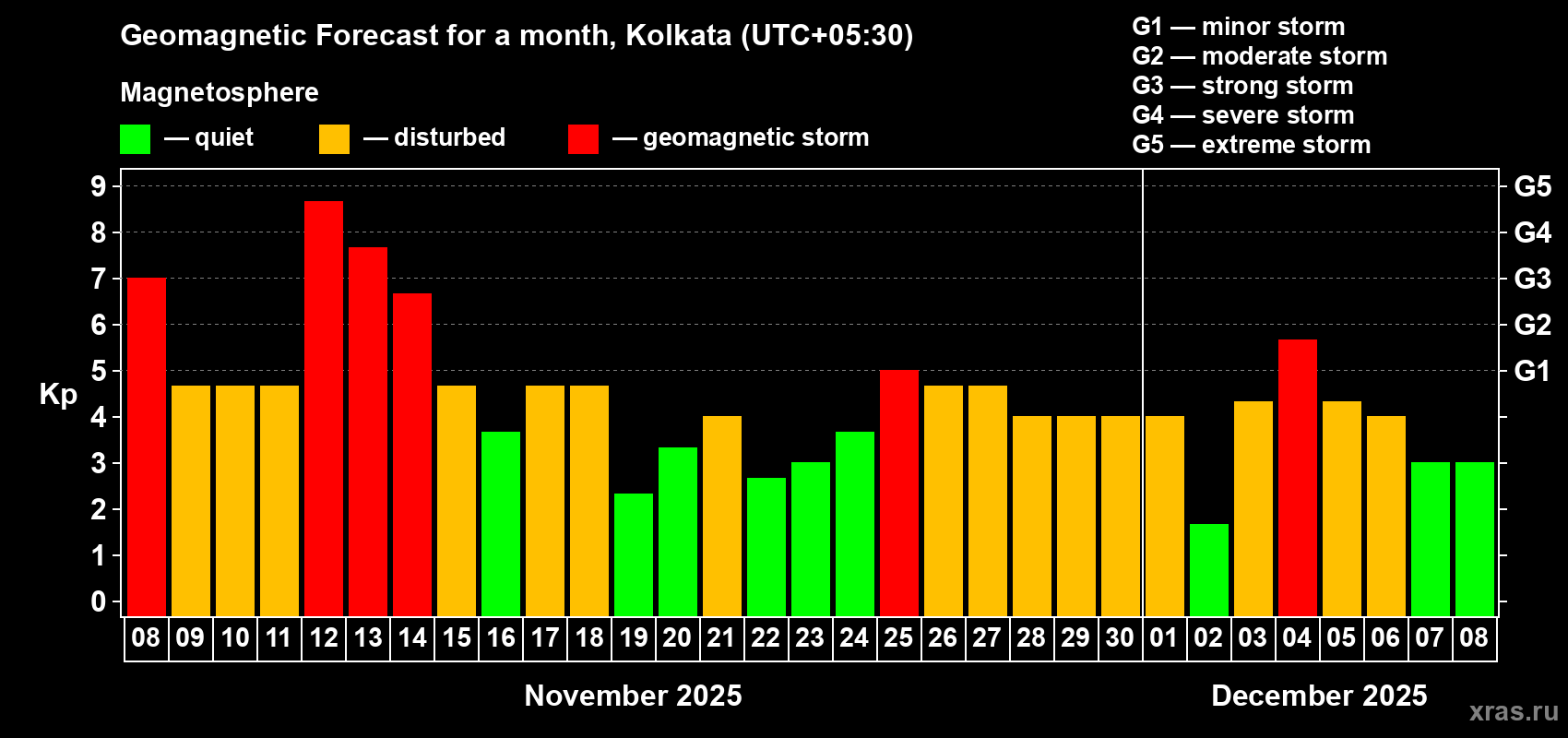 Geomagnetic storm forecast in Kolkata for Nov 08, 2025