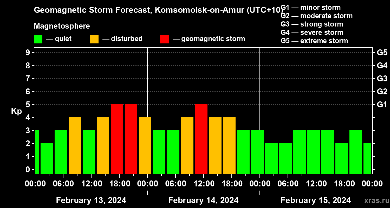 Geomagnetic storm forecast in Komsomolsk-on-Amur for Feb 13, 2024