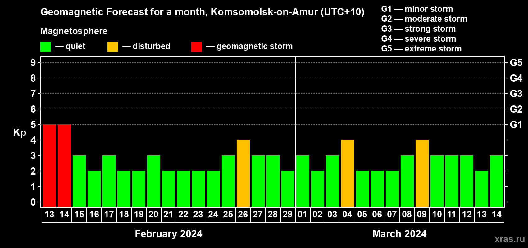 Geomagnetic activity forecast in Komsomolsk-on-Amur — Feb 13, 2024