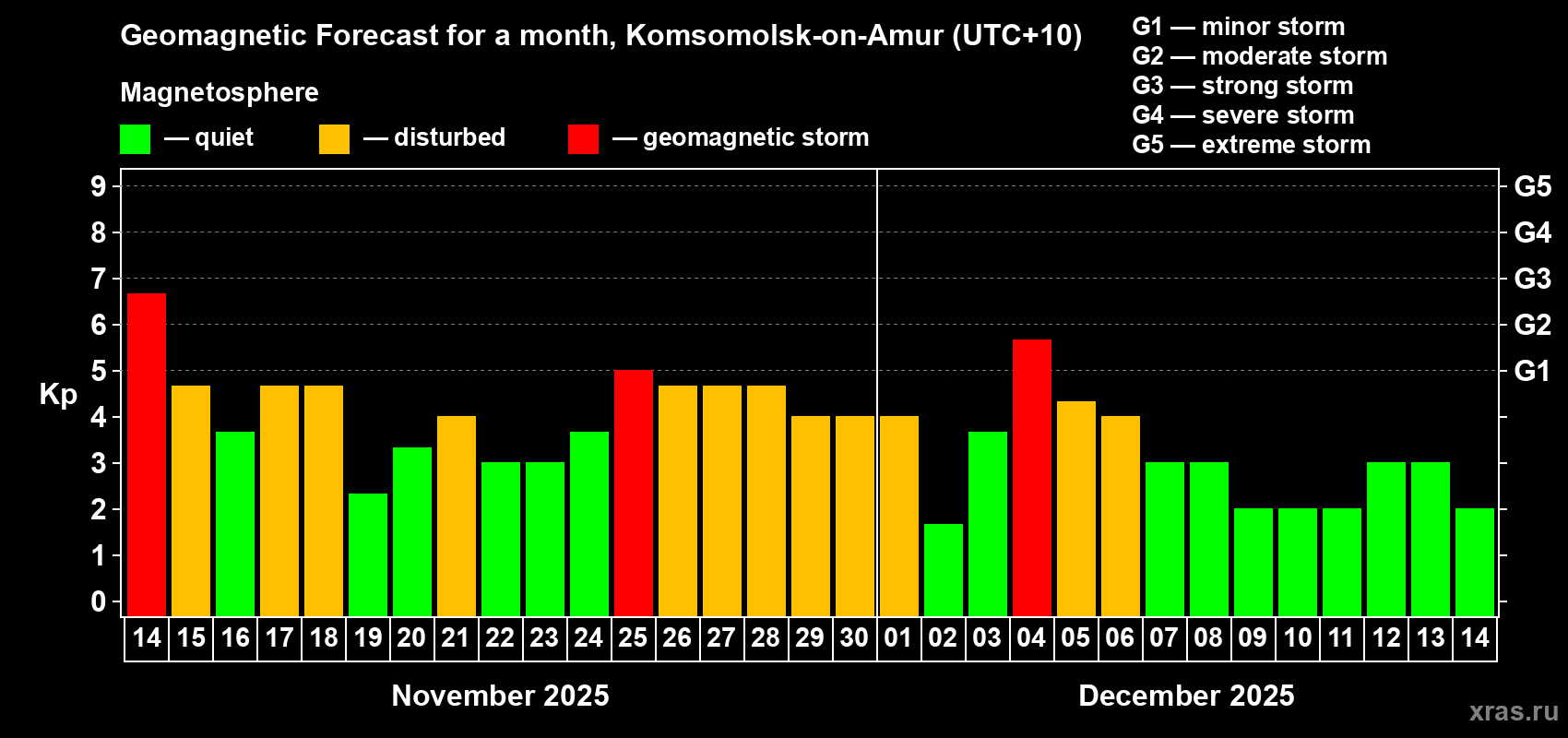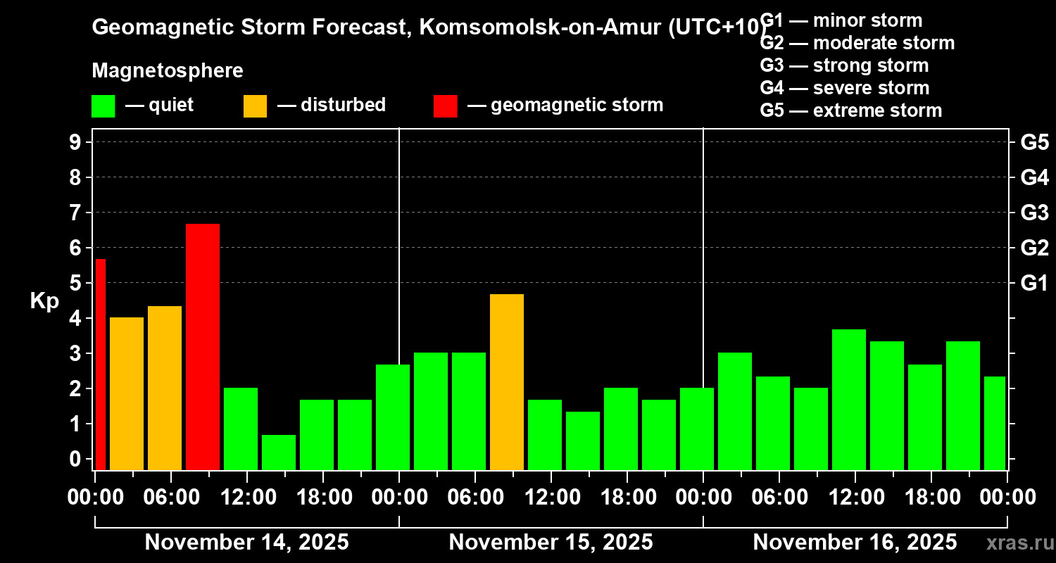 Geomagnetic storm forecast in Komsomolsk-on-Amur for Nov 14, 2025