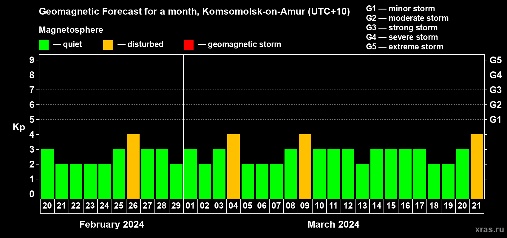 Geomagnetic activity forecast in Komsomolsk-on-Amur — Feb 20, 2024