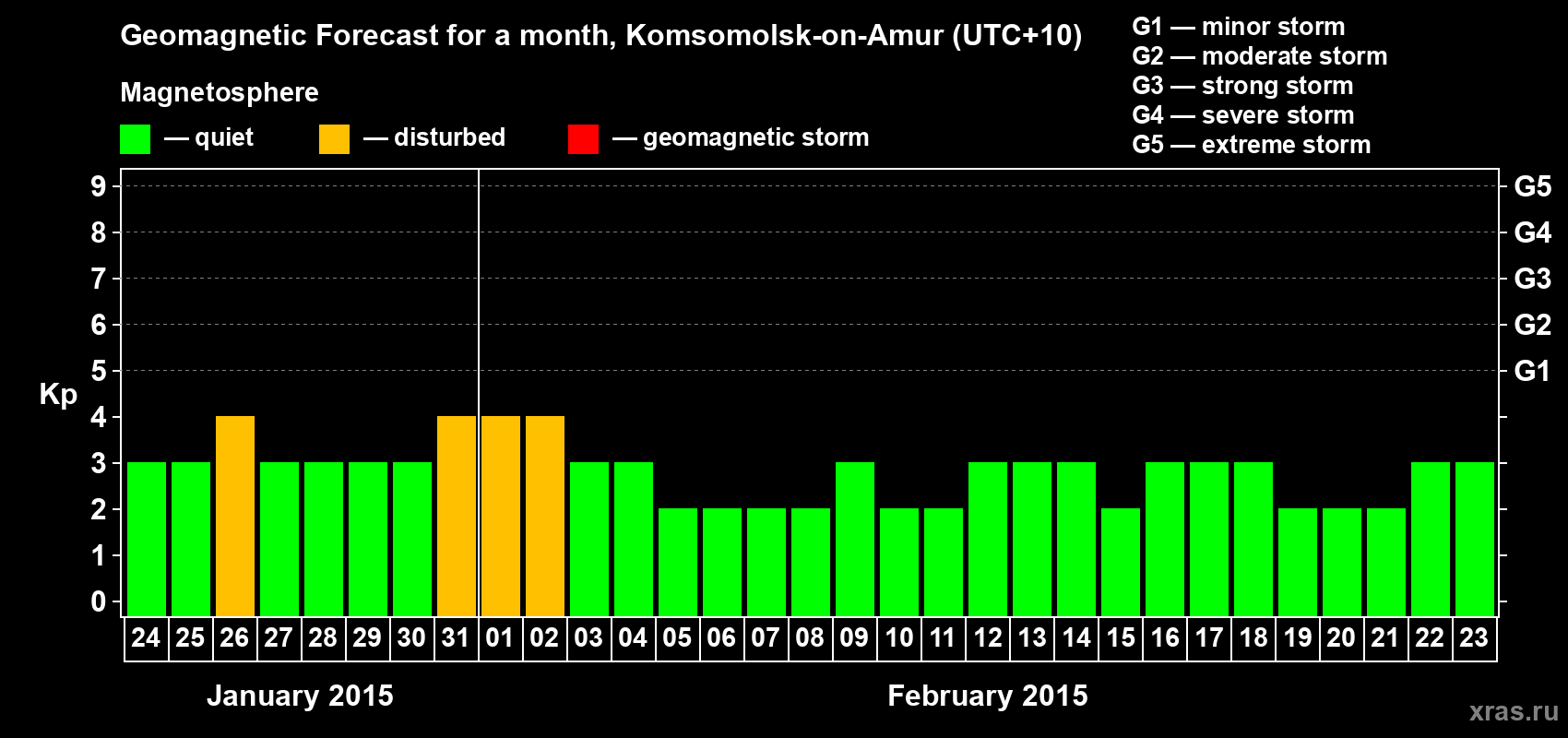 Geomagnetic storm forecast in Komsomolsk-on-Amur for Jan 24, 2015