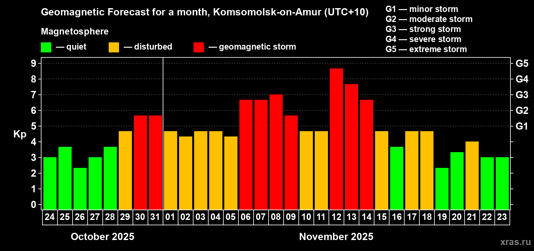 Geomagnetic activity forecast in Komsomolsk-on-Amur — Oct 24, 2025
