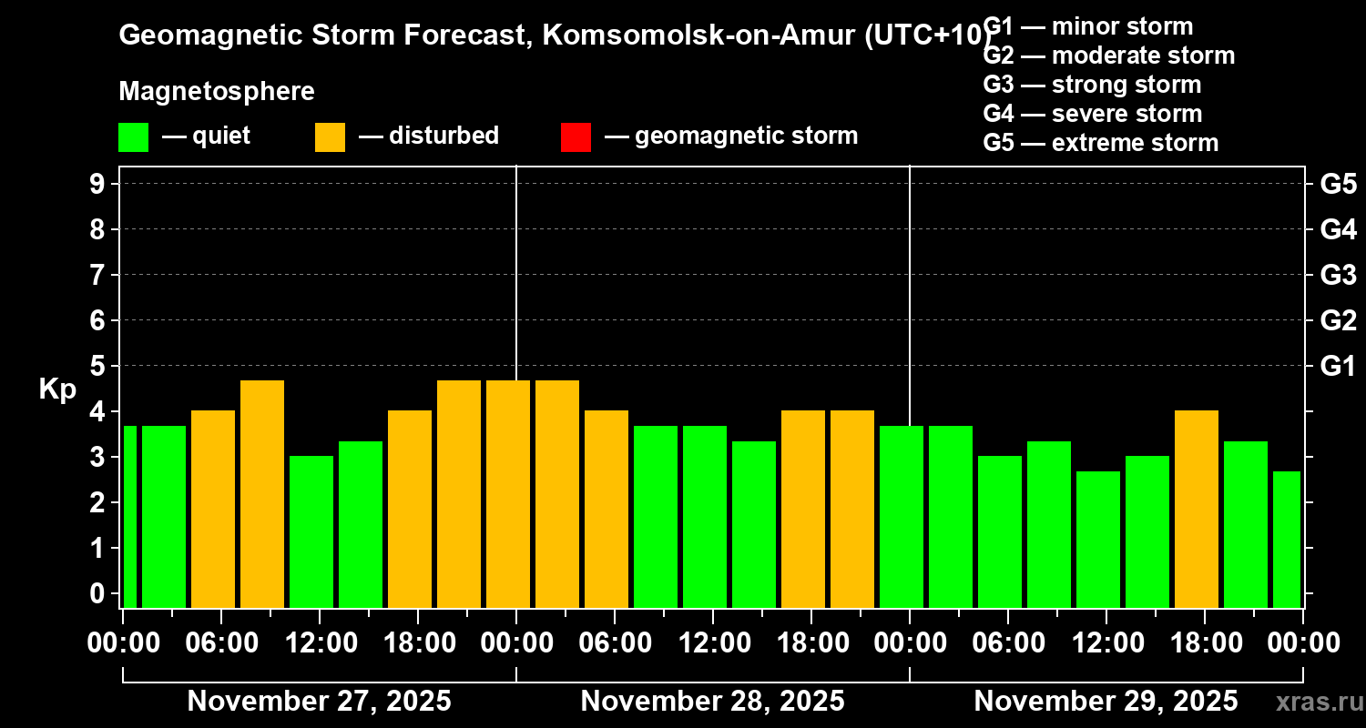Geomagnetic activity forecast in Komsomolsk-on-Amur — Nov 27, 2025
