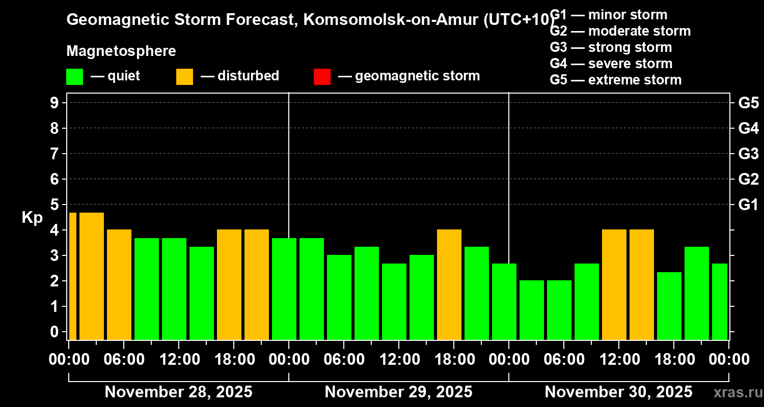 Geomagnetic storm forecast in Komsomolsk-on-Amur for Nov 28, 2025