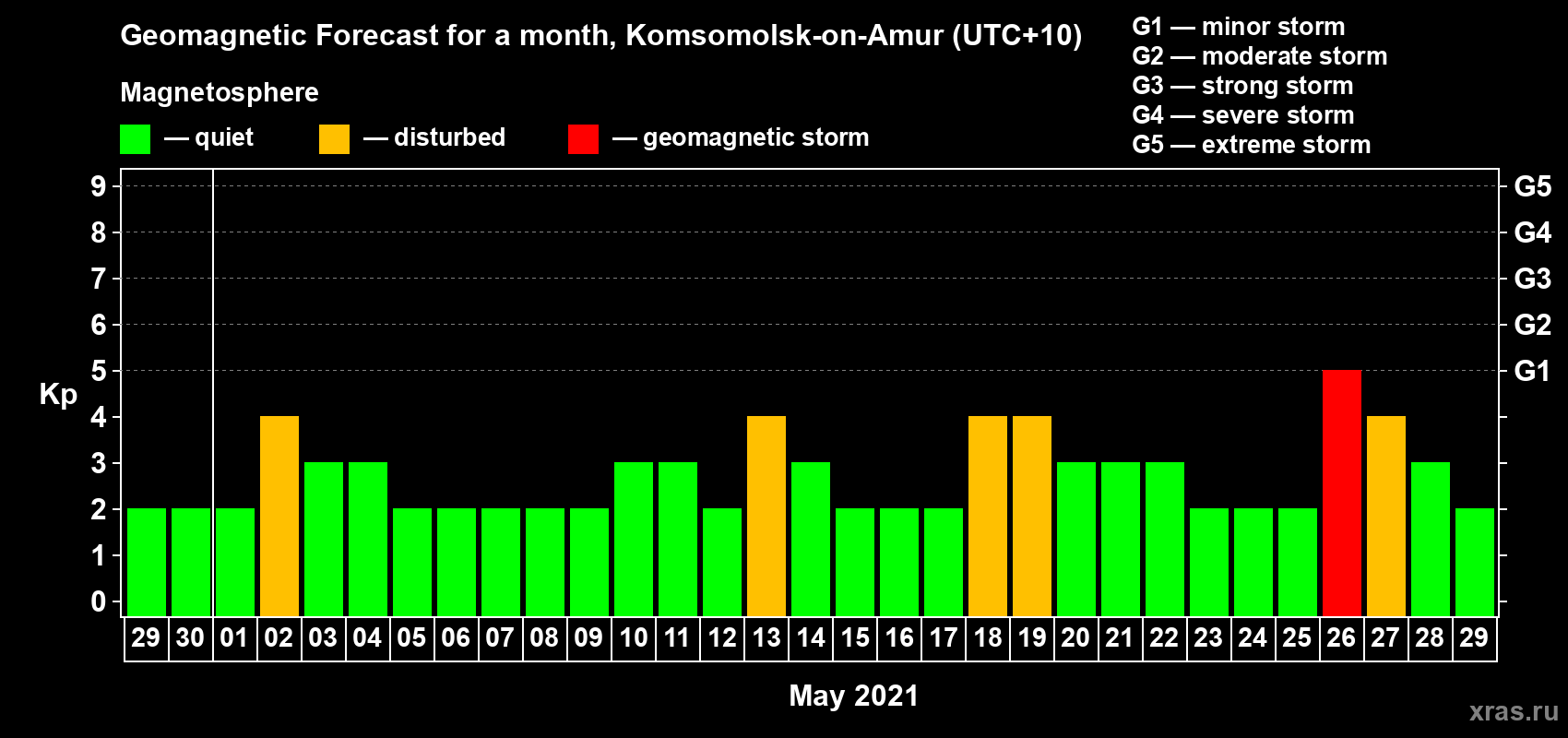 Geomagnetic storm forecast in Komsomolsk-on-Amur for Apr 29, 2021