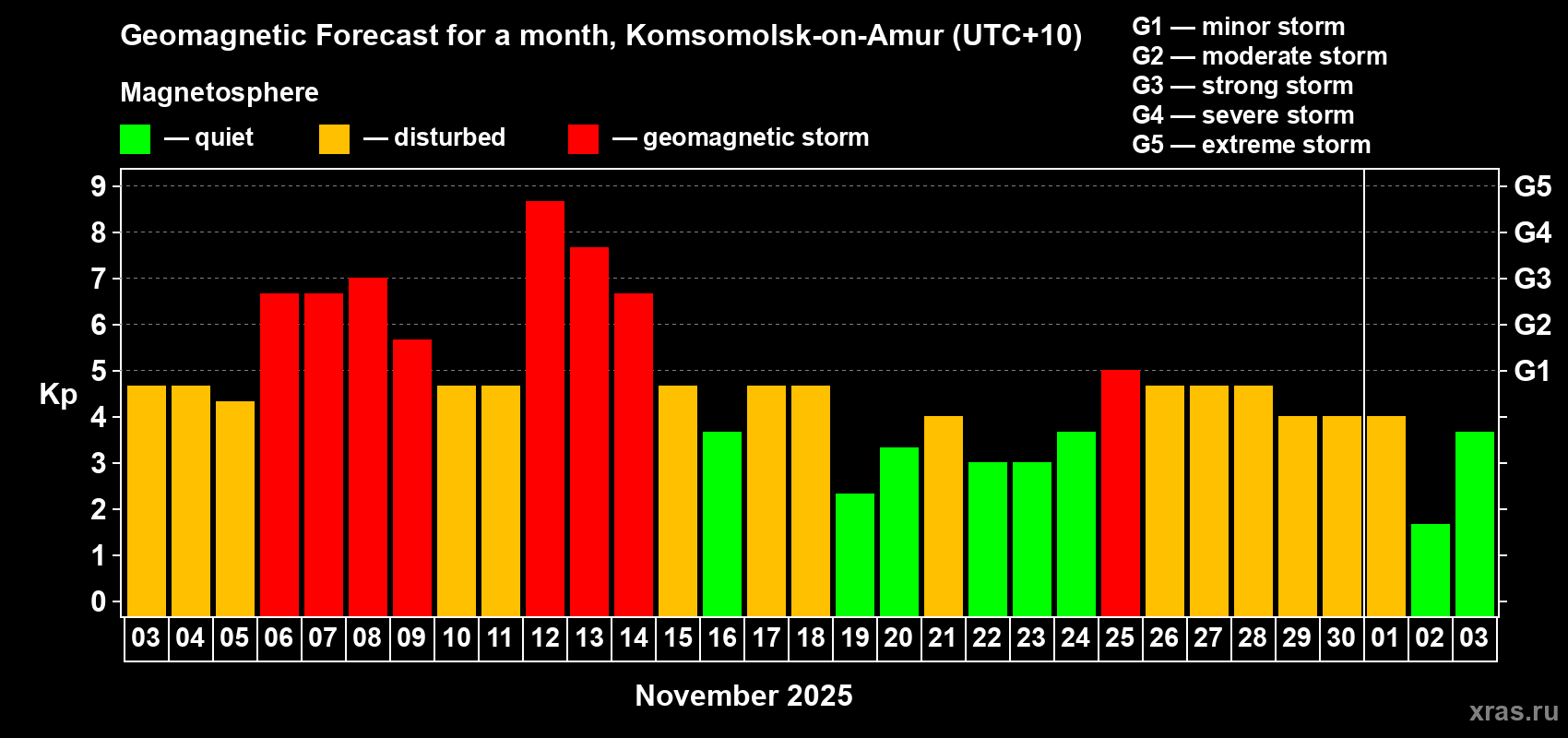 Geomagnetic storm forecast in Komsomolsk-on-Amur for Nov 03, 2025