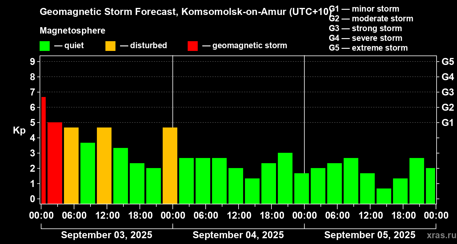 Geomagnetic storm forecast in Komsomolsk-on-Amur for Sep 03, 2025
