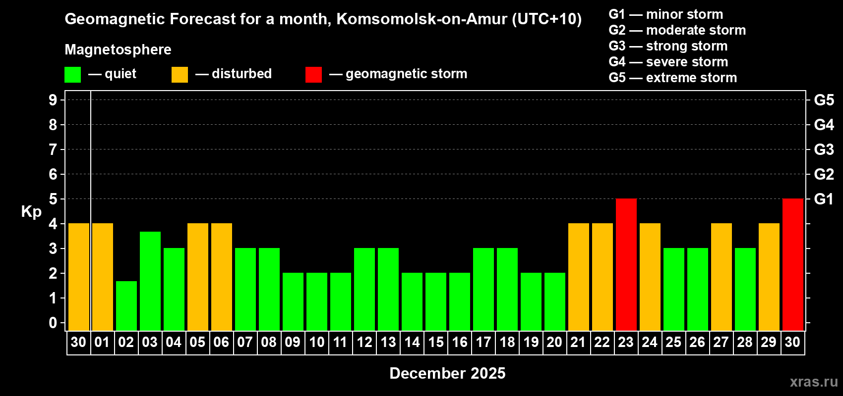 Geomagnetic storm forecast in Komsomolsk-on-Amur for Nov 30, 2025