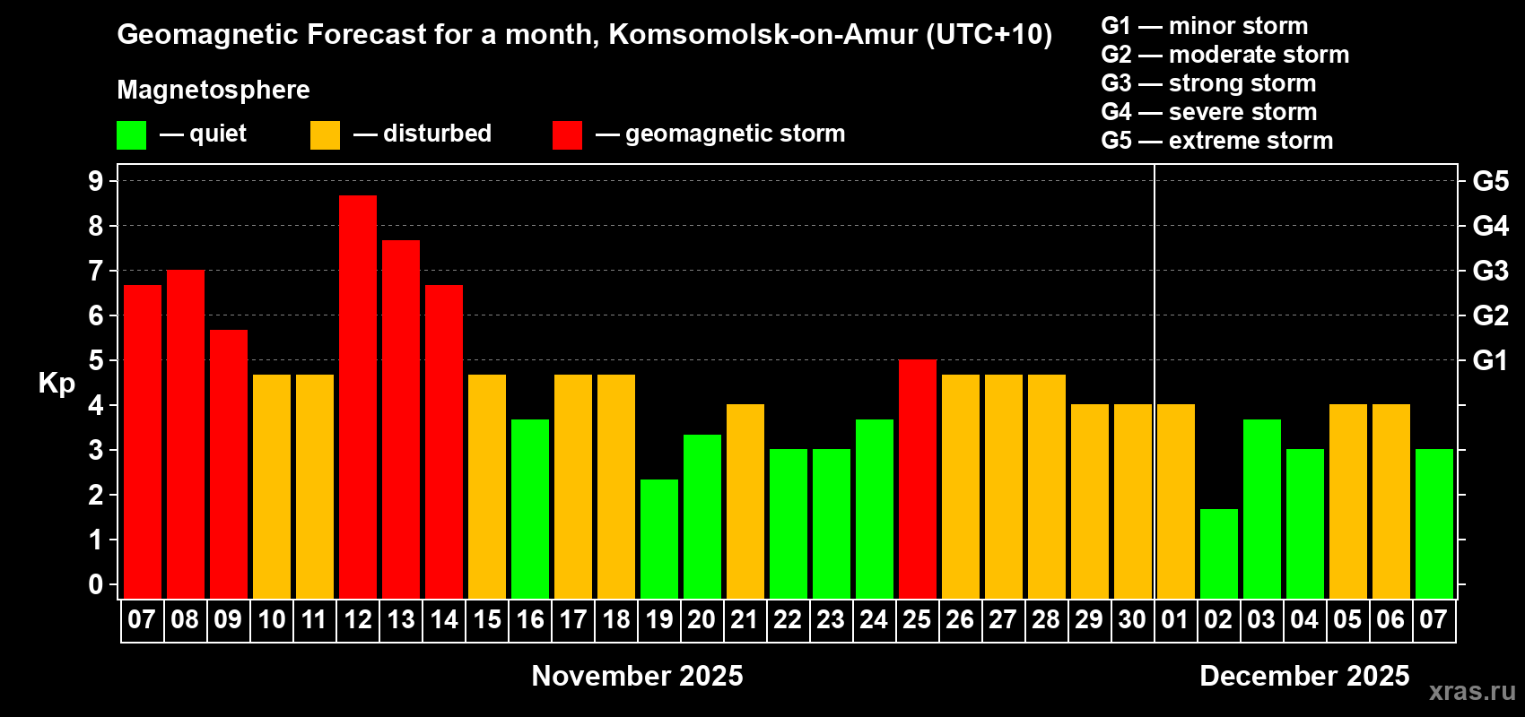 Geomagnetic storm forecast in Komsomolsk-on-Amur for Nov 07, 2025