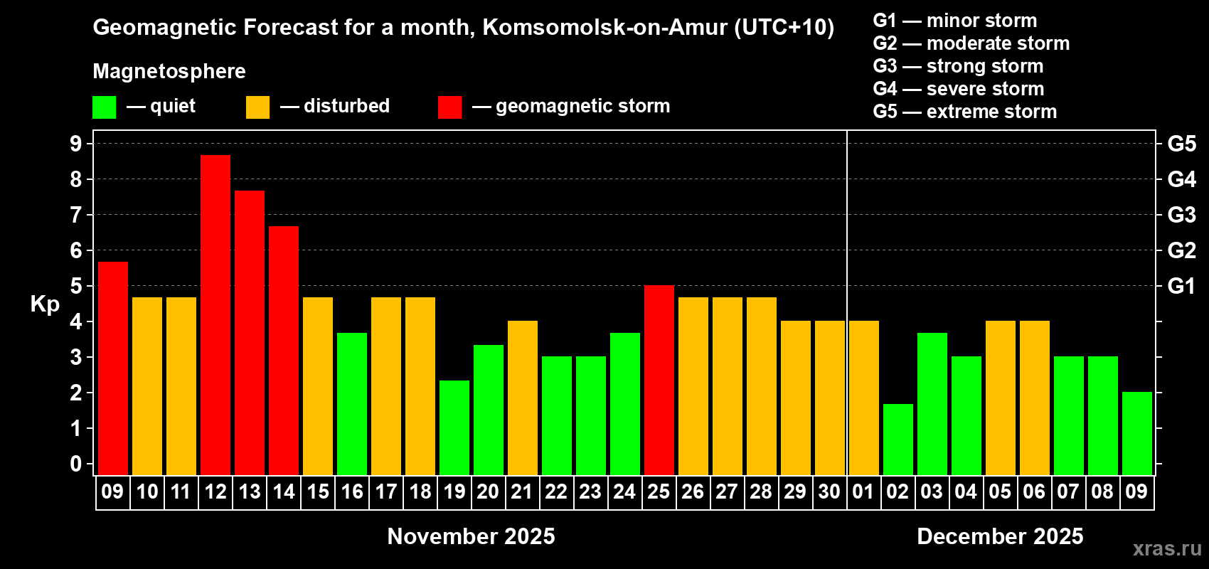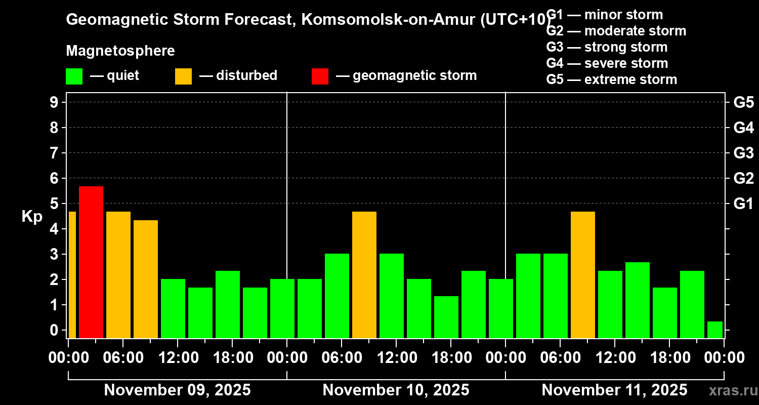Geomagnetic storm forecast in Komsomolsk-on-Amur for Nov 09, 2025