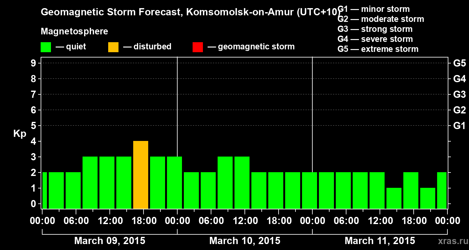 Geomagnetic storm forecast in Komsomolsk-on-Amur for Mar 09, 2015