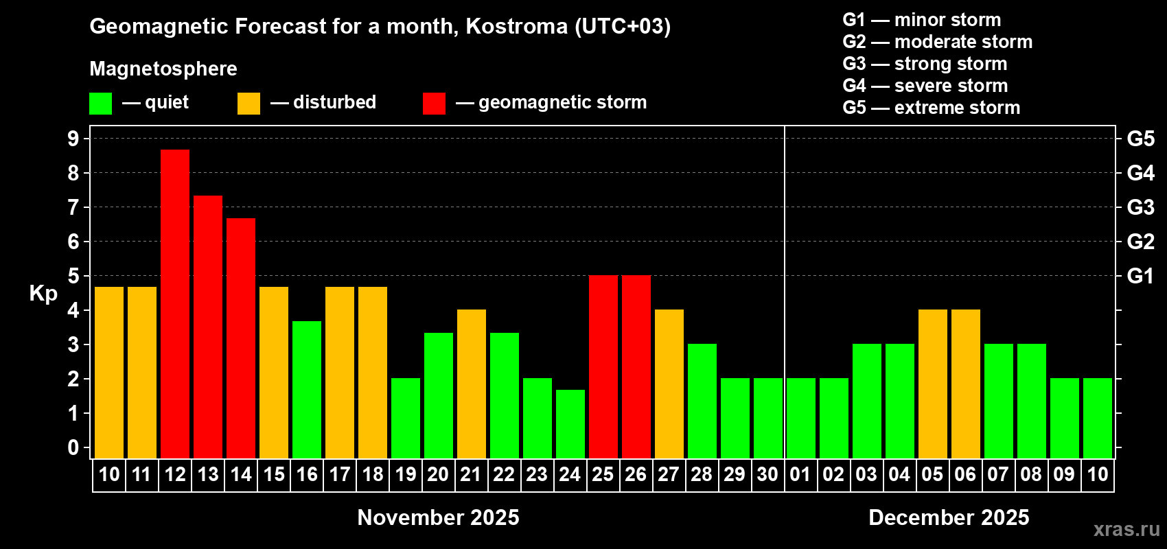 Geomagnetic storm forecast in Kostroma for Nov 10, 2025