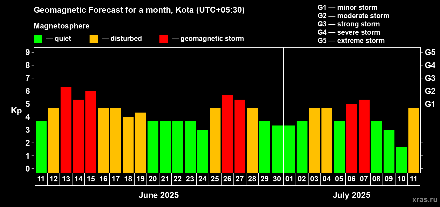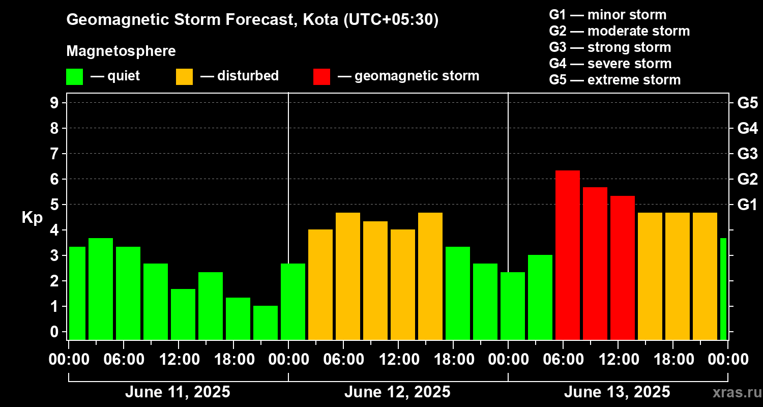 Geomagnetic storm forecast in Kota for Jun 11, 2025