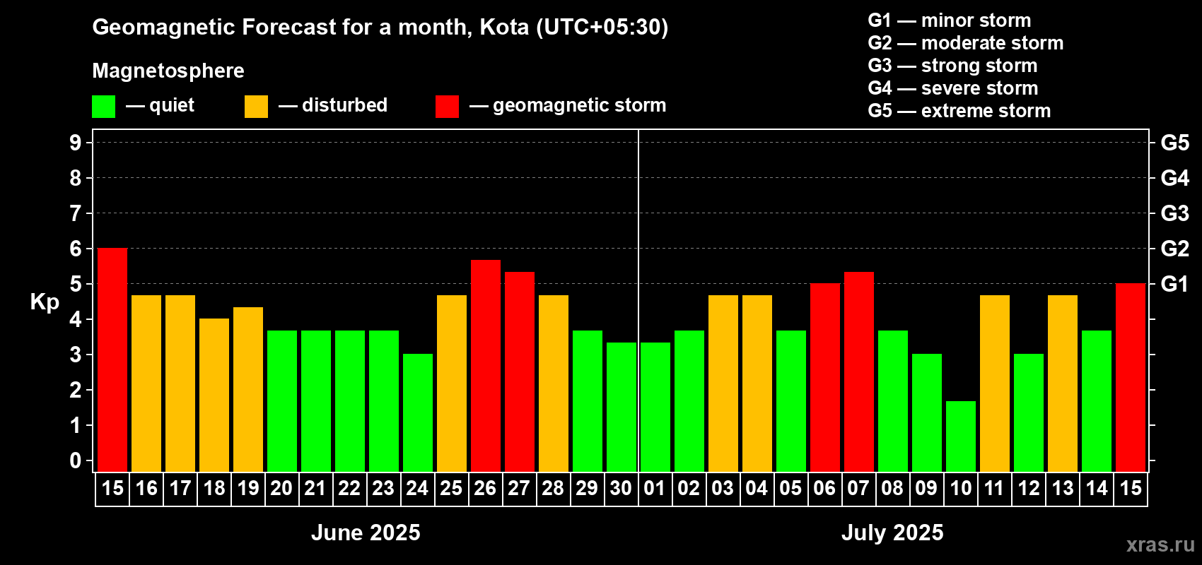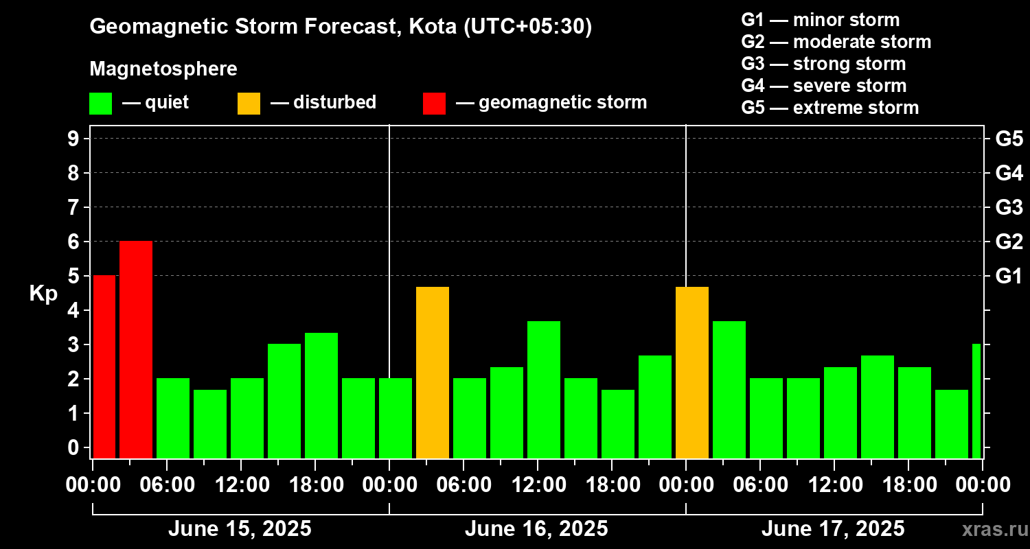 Geomagnetic storm forecast in Kota for Jun 15, 2025