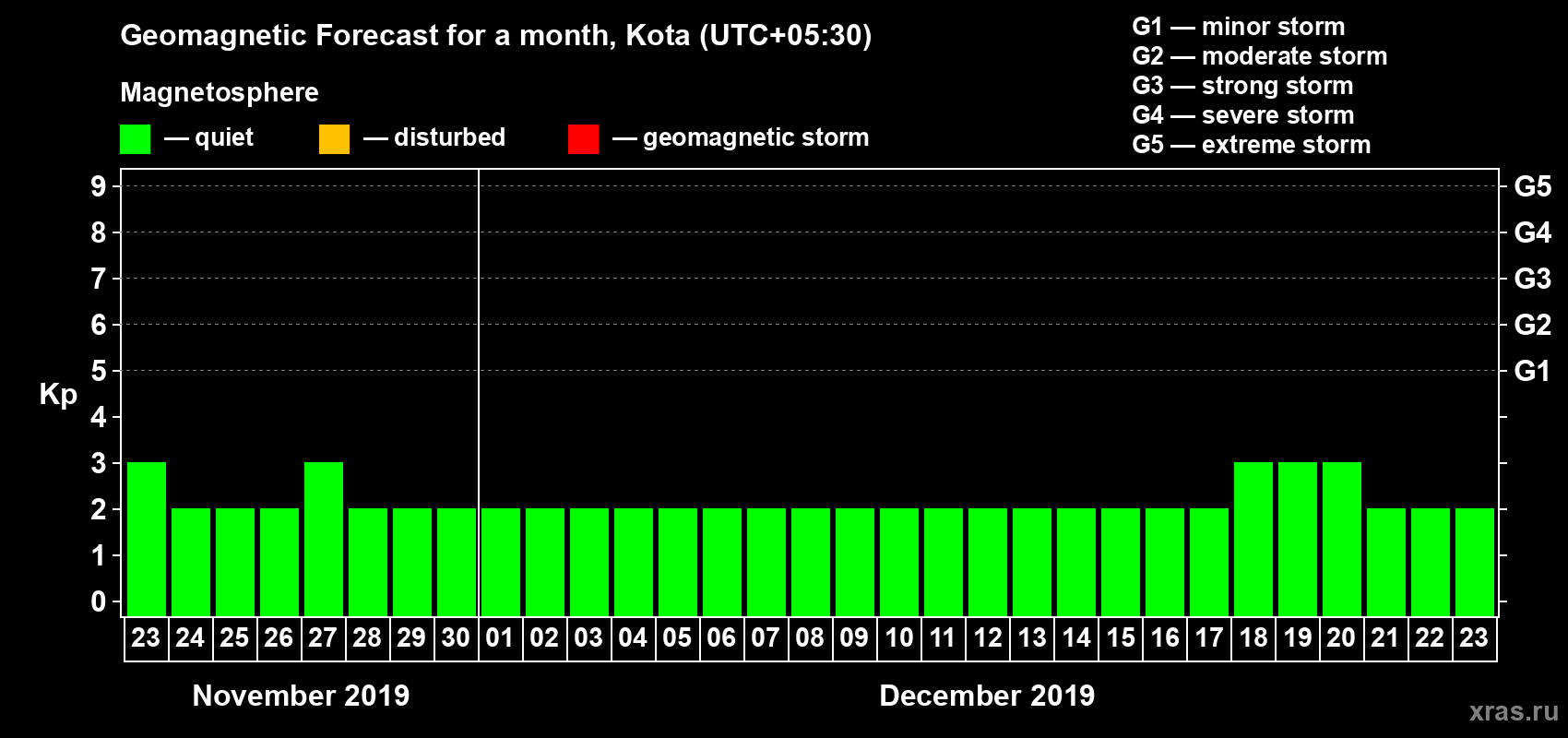 Geomagnetic storm forecast in Kota for Nov 23, 2019