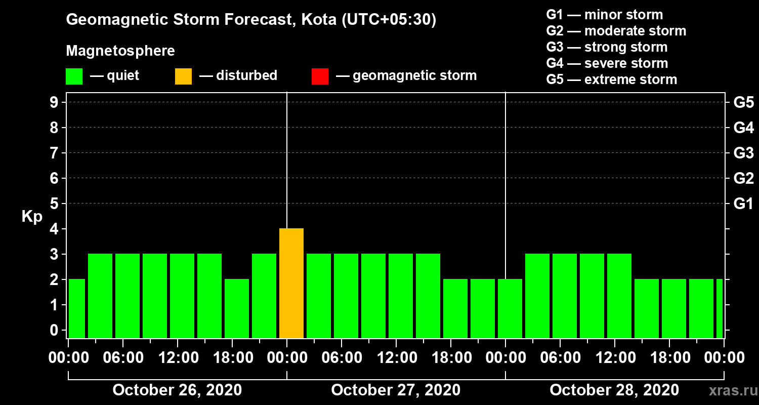 Geomagnetic storm forecast in Kota for Oct 26, 2020