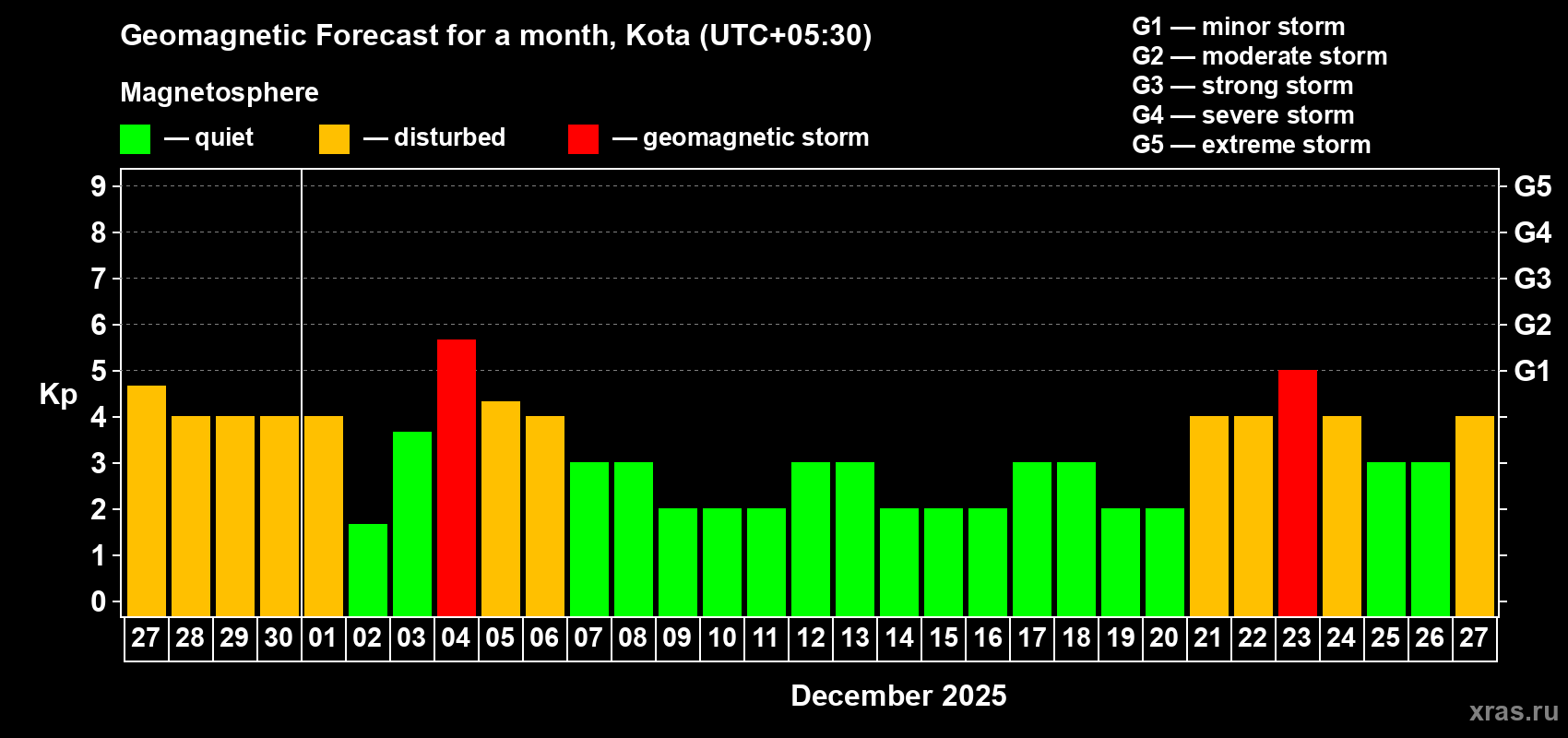 Geomagnetic storm forecast in Kota for Nov 27, 2025