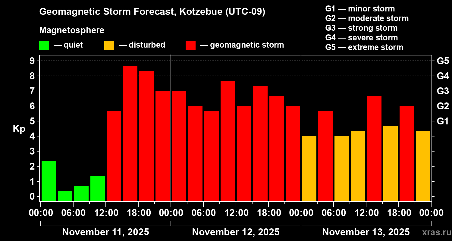 Geomagnetic storm forecast in Kotzebue for Nov 11, 2025