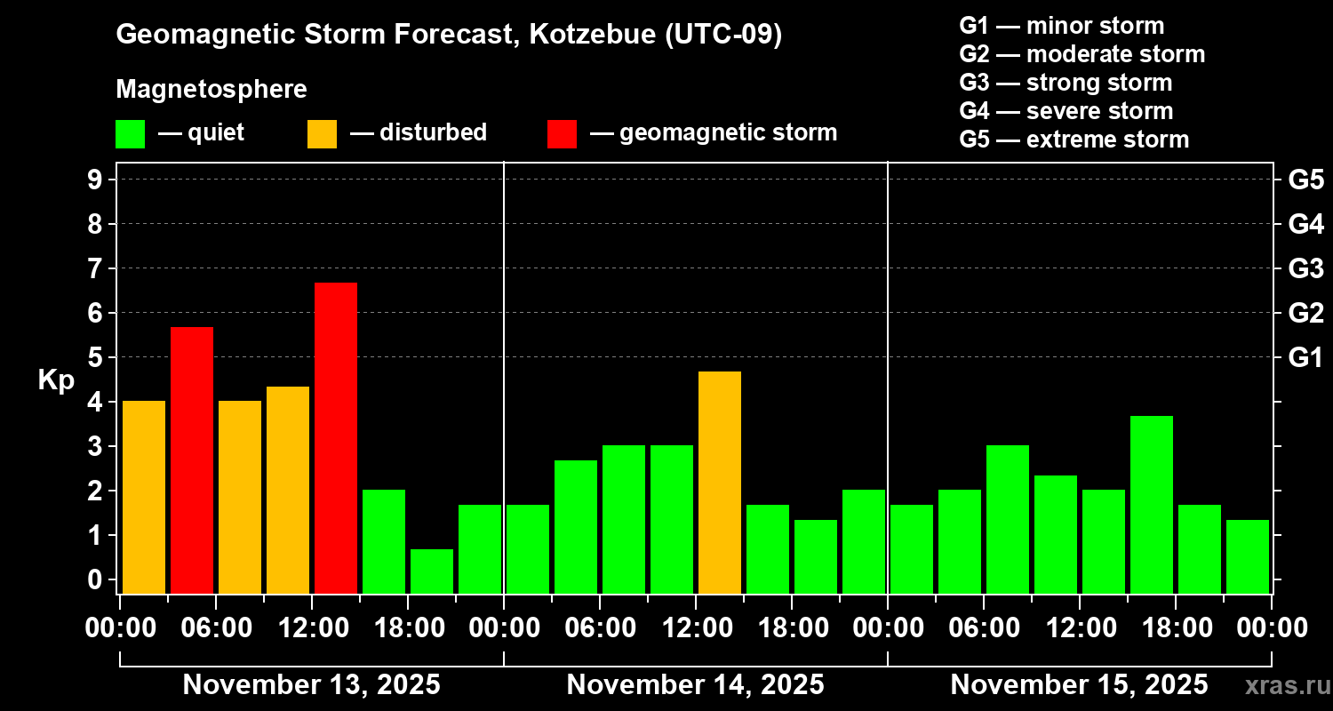 Geomagnetic storm forecast in Kotzebue for Nov 13, 2025
