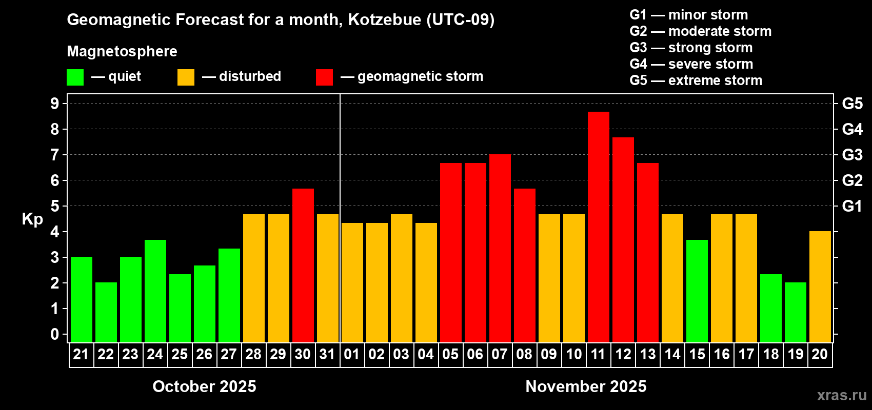 Geomagnetic storm forecast in Kotzebue for Oct 21, 2025