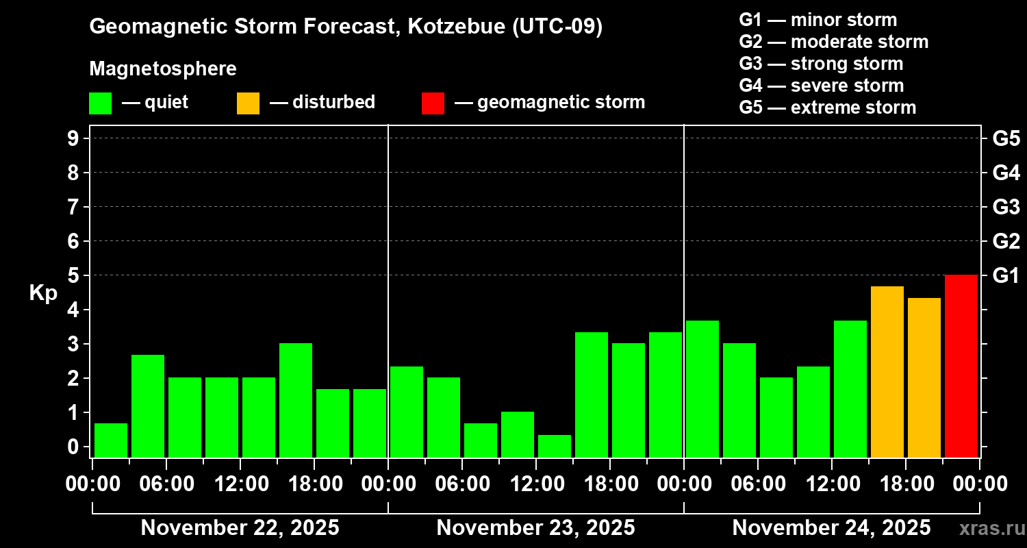 Geomagnetic storm forecast in Kotzebue for Nov 22, 2025
