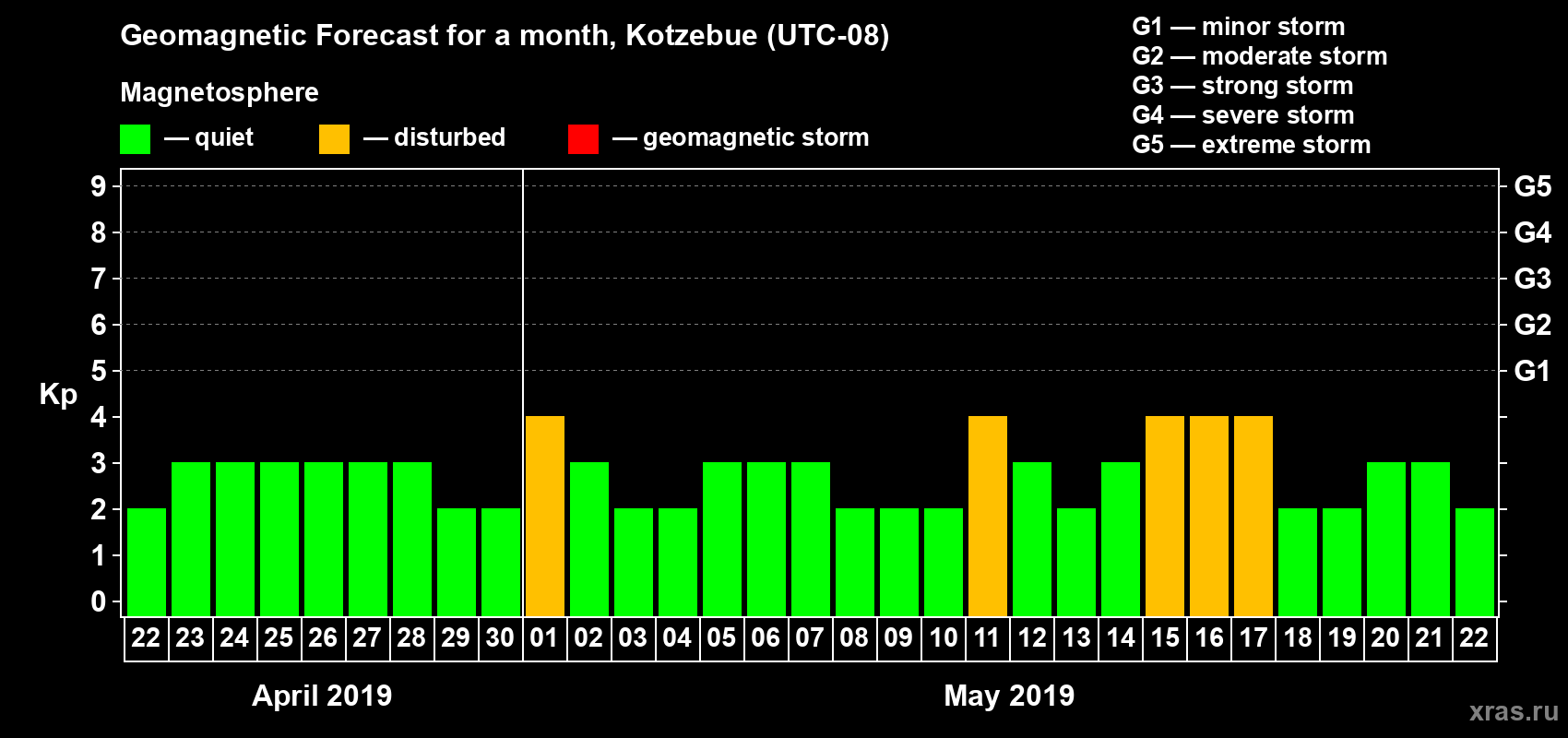 Geomagnetic storm forecast in Kotzebue for Apr 22, 2019