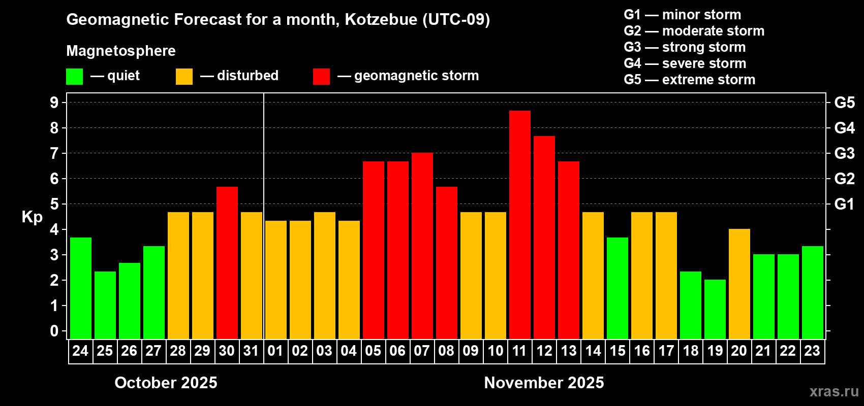 Geomagnetic storm forecast in Kotzebue for Oct 24, 2025