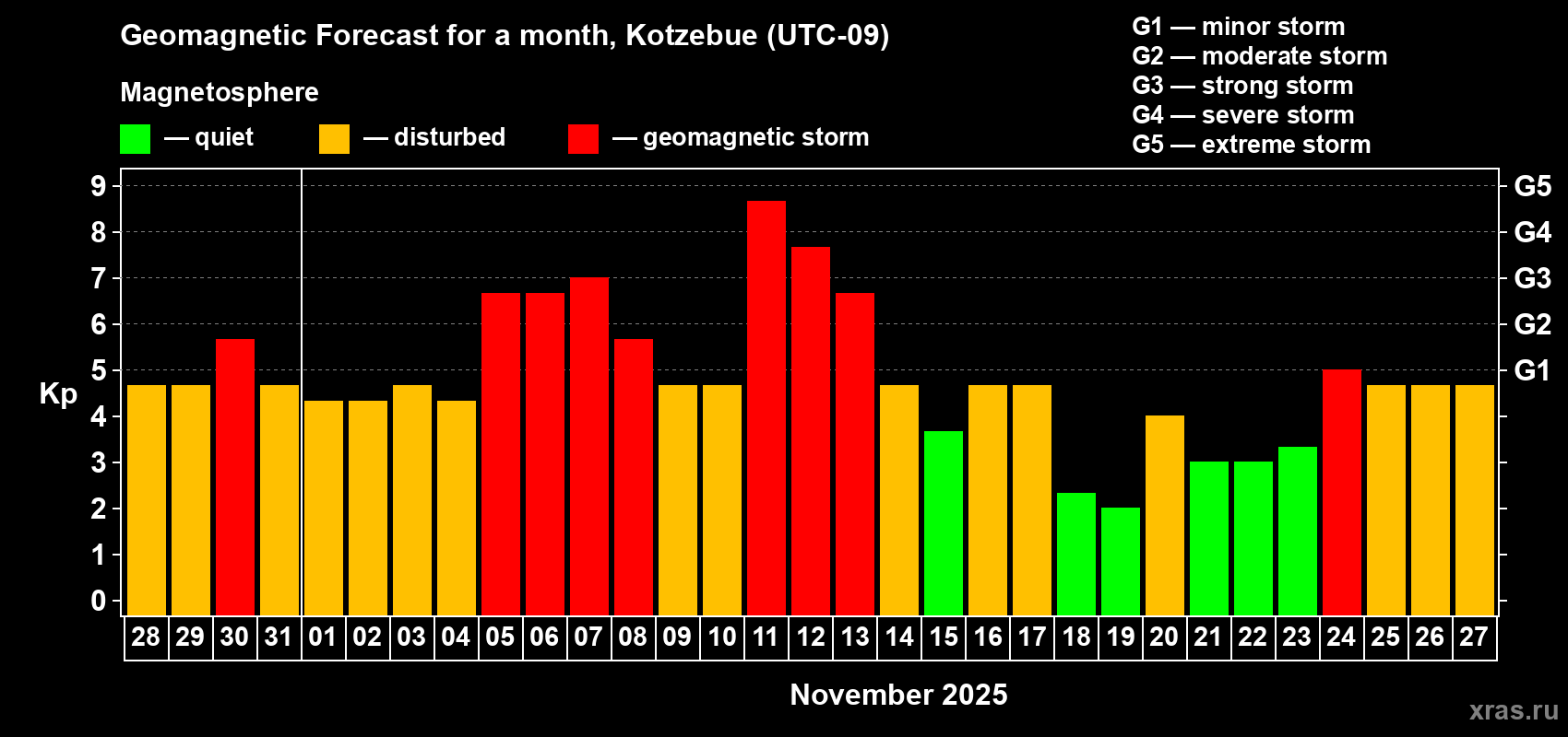 Geomagnetic storm forecast in Kotzebue for Oct 28, 2025