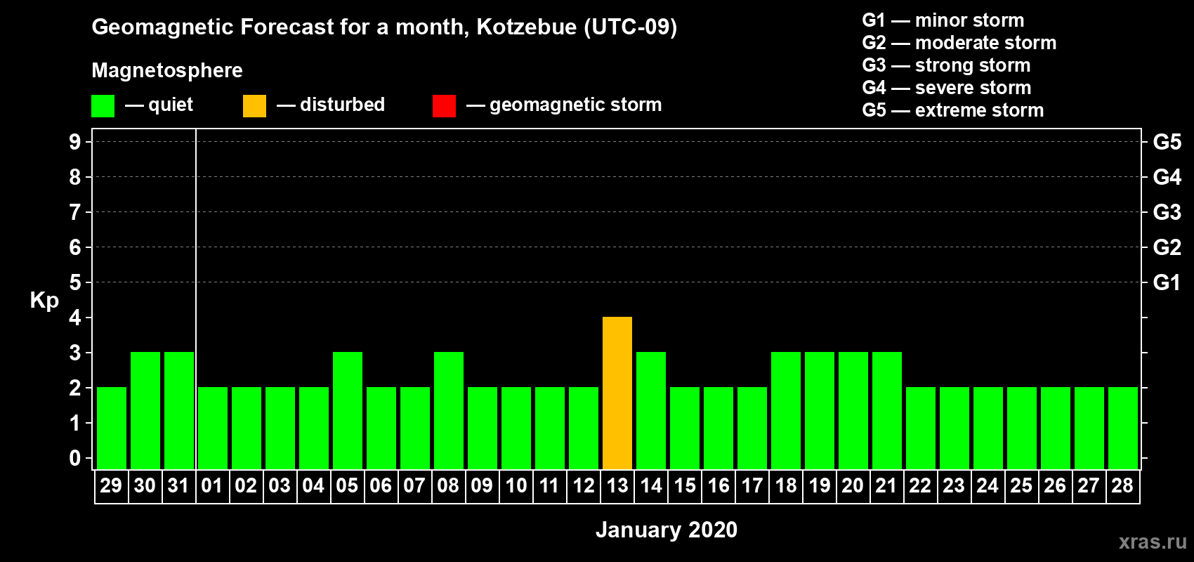 Geomagnetic storm forecast in Kotzebue for Dec 29, 2019