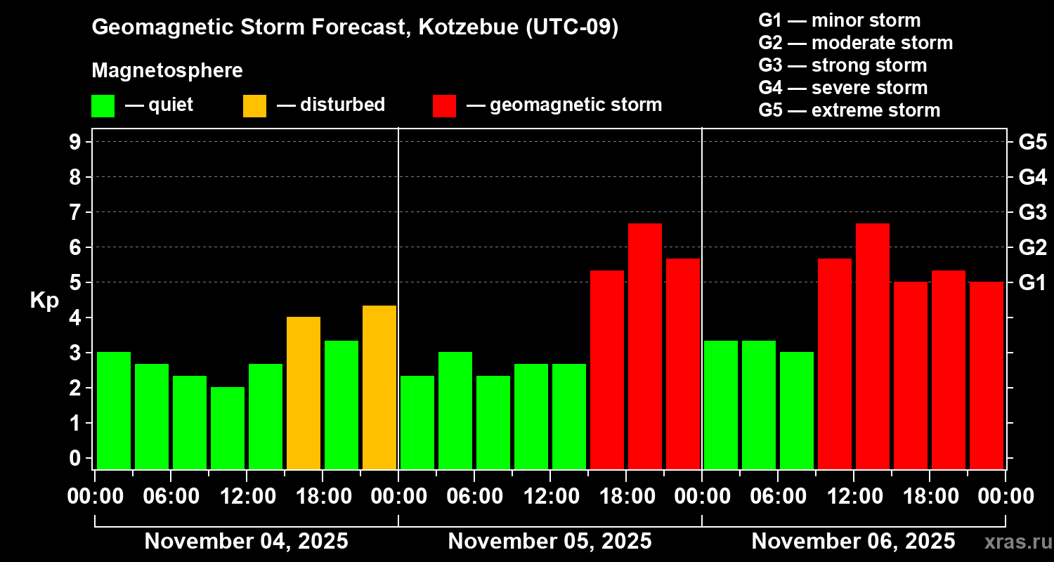 Geomagnetic storm forecast in Kotzebue for Nov 04, 2025