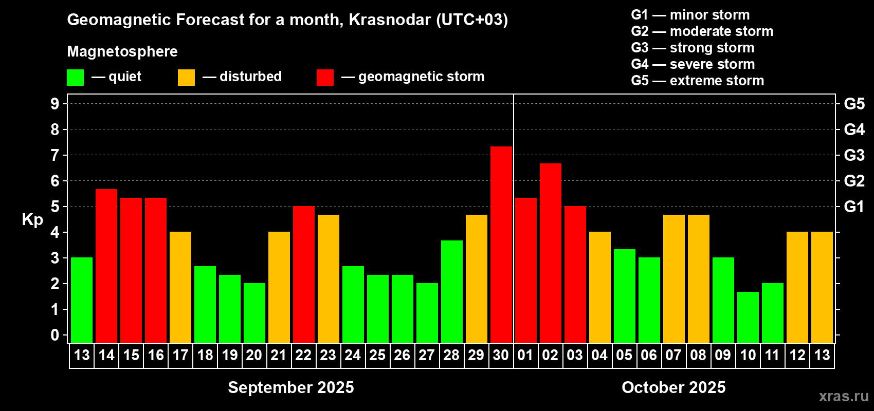 Geomagnetic storm forecast in Krasnodar for Sep 13, 2025