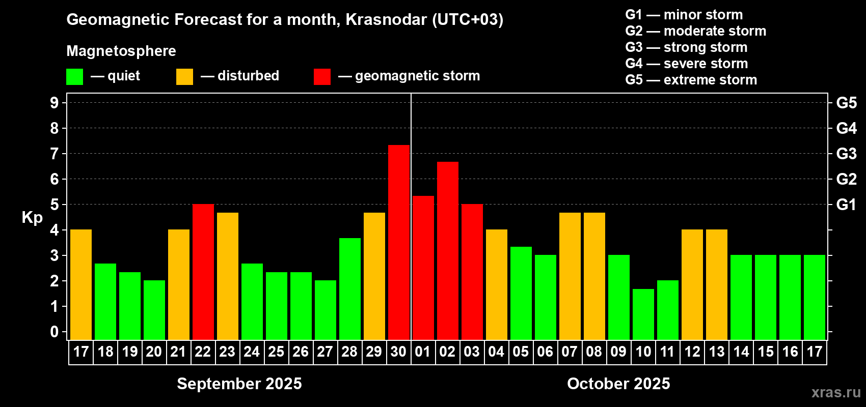 Geomagnetic storm forecast in Krasnodar for Sep 17, 2025