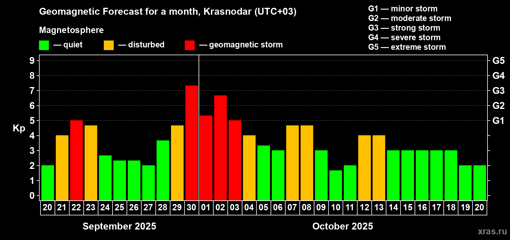 Geomagnetic storm forecast in Krasnodar for Sep 20, 2025