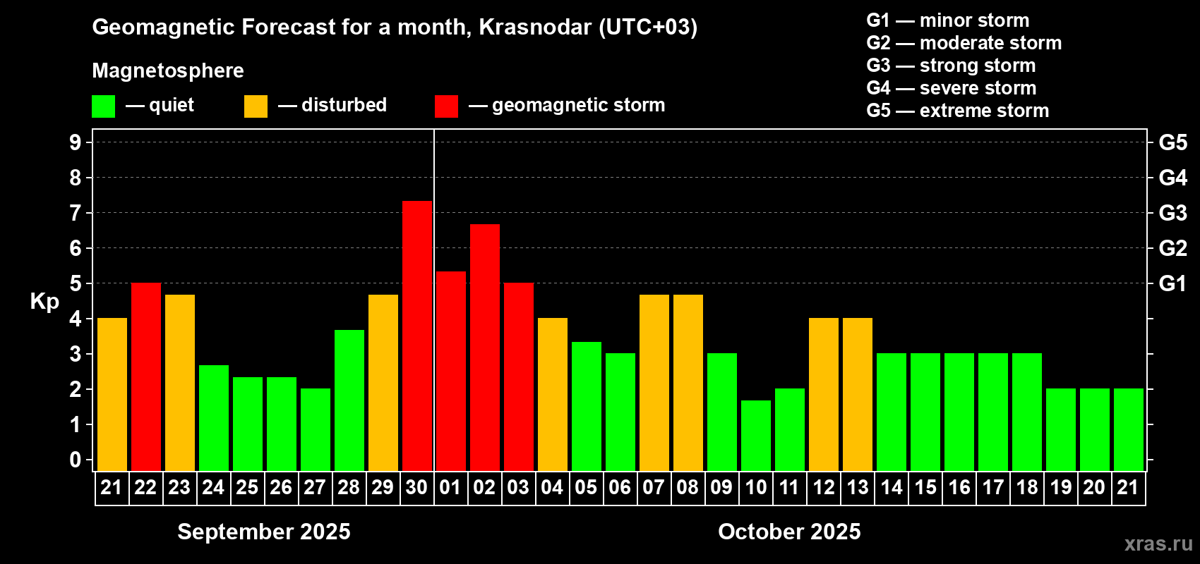 Geomagnetic storm forecast in Krasnodar for Sep 21, 2025