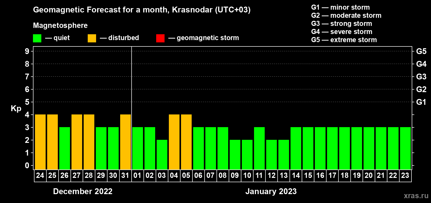Geomagnetic storm forecast in Krasnodar for Dec 24, 2022