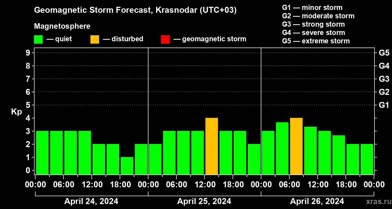 Geomagnetic storm forecast in Krasnodar for Apr 24, 2024