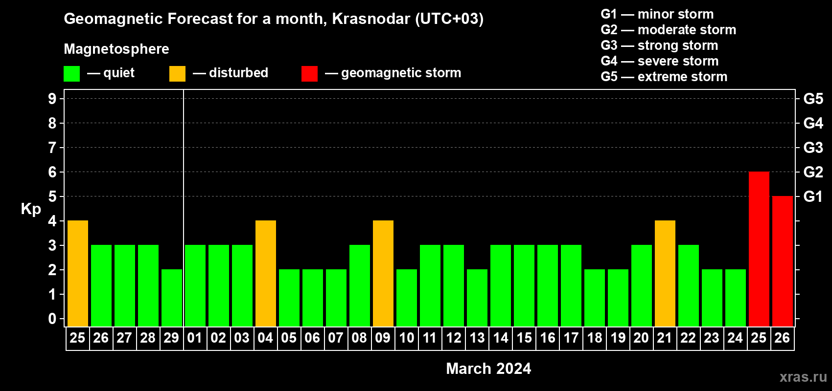 Geomagnetic storm forecast in Krasnodar for Feb 25, 2024