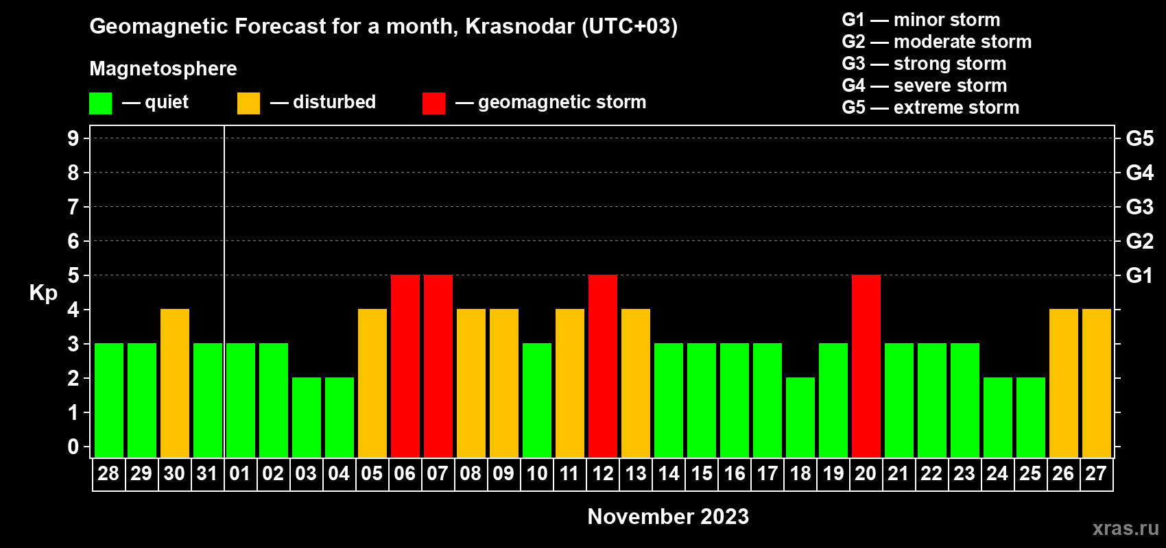Geomagnetic activity forecast in Krasnodar — Oct 28, 2023