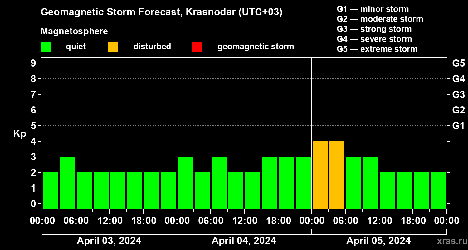 Geomagnetic storm forecast in Krasnodar for Apr 03, 2024