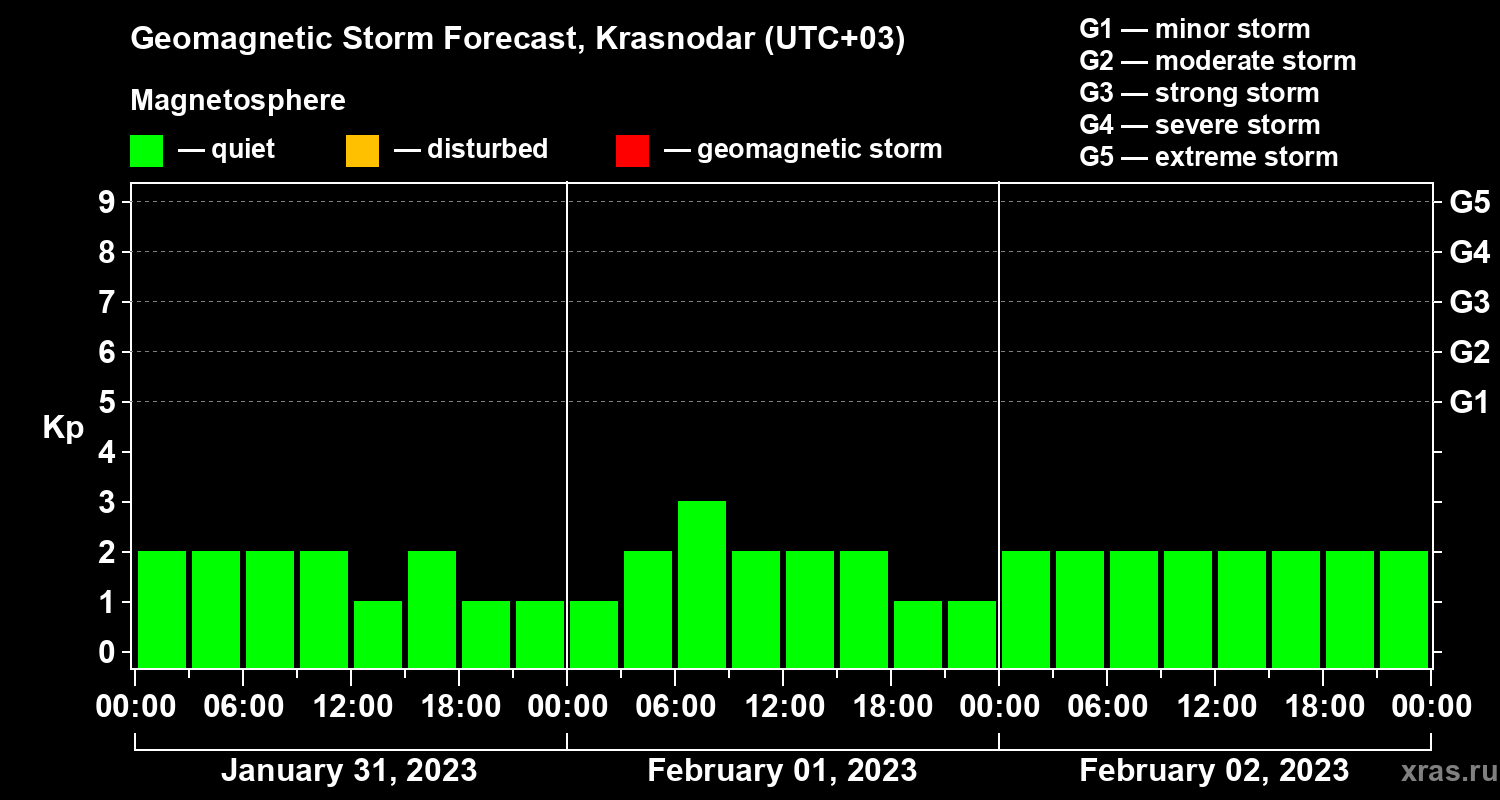 Geomagnetic storm forecast in Krasnodar for Jan 31, 2023