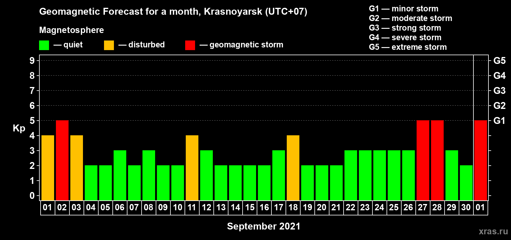 Geomagnetic storm forecast in Krasnoyarsk for Sep 01, 2021