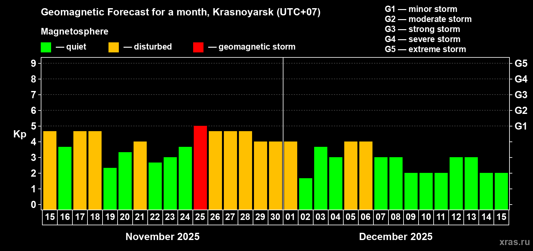 Geomagnetic storm forecast in Krasnoyarsk for Nov 15, 2025