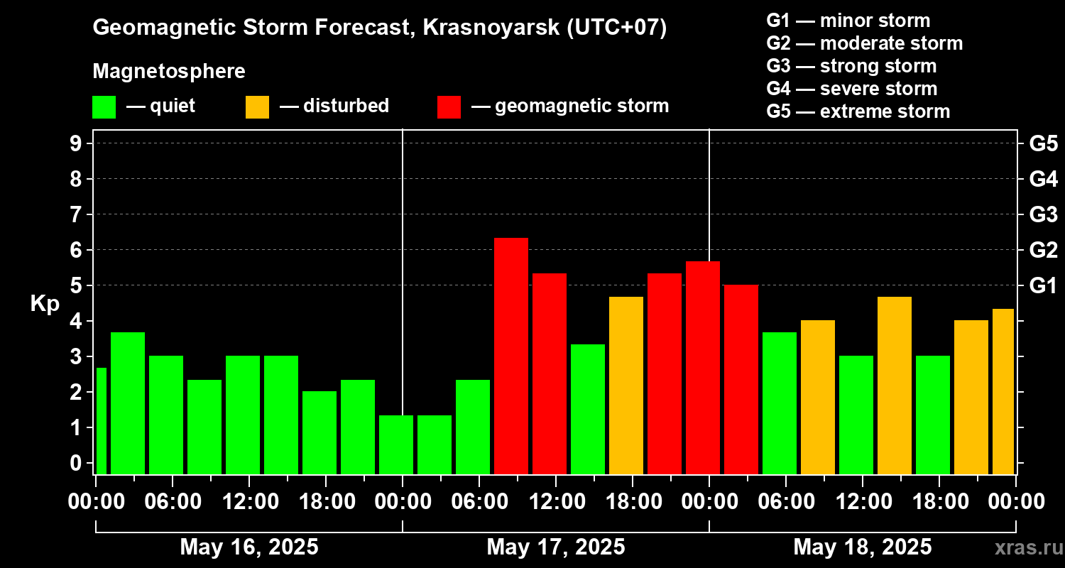Geomagnetic storm forecast in Krasnoyarsk for May 16, 2025