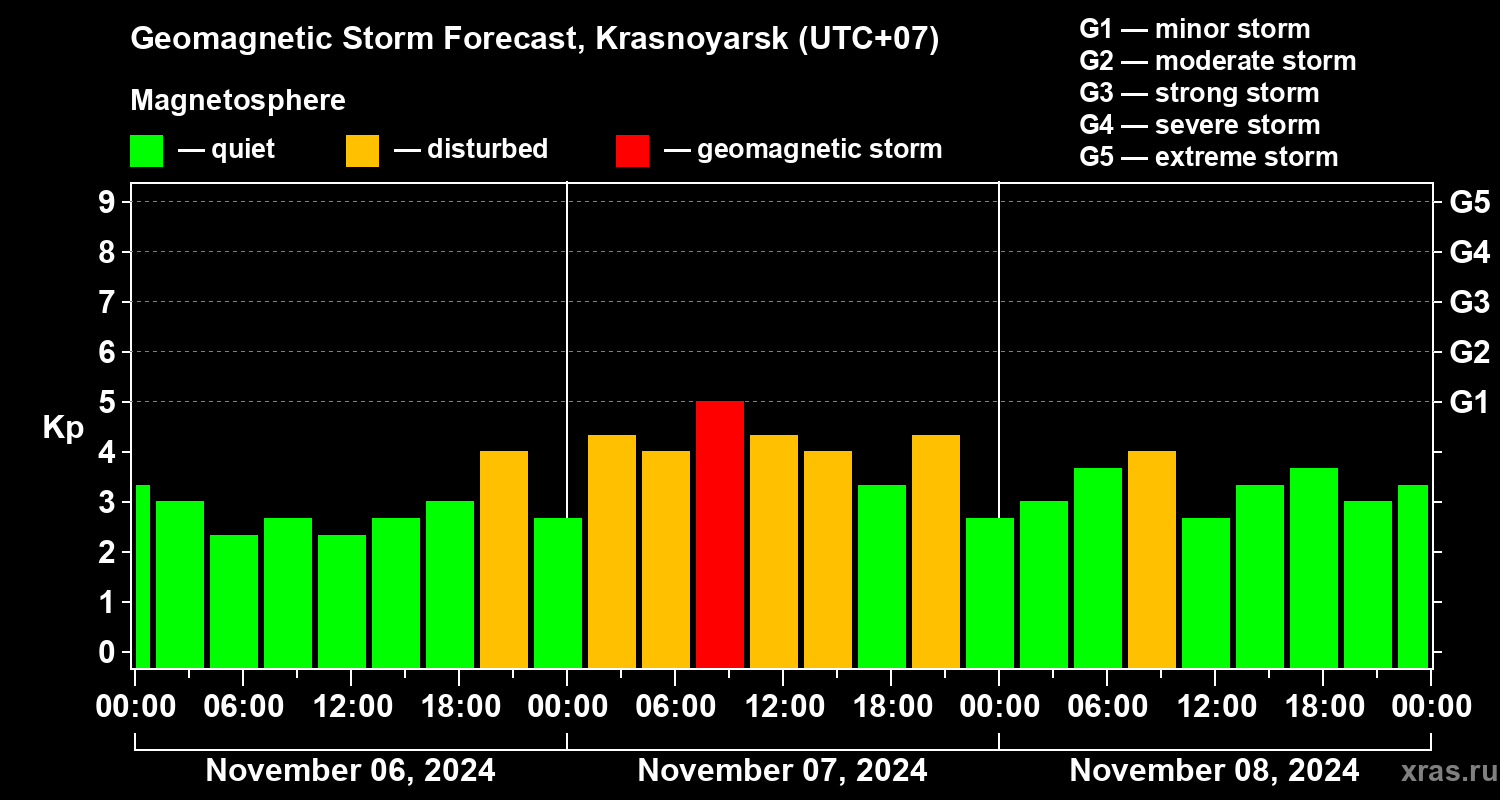 Geomagnetic storm forecast in Krasnoyarsk for Nov 06, 2024