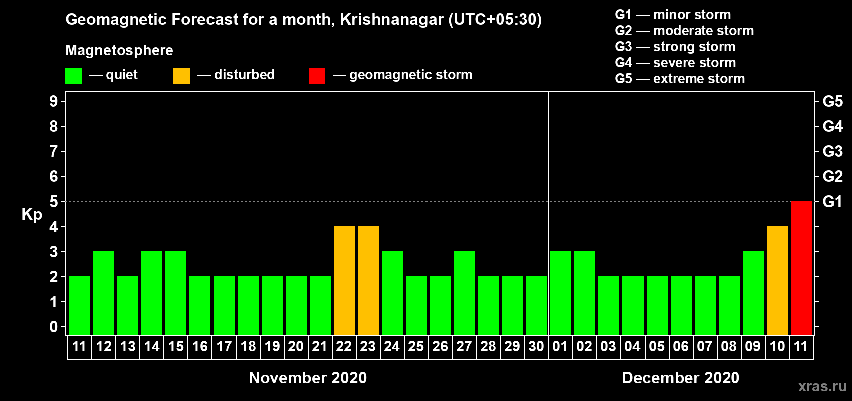 Geomagnetic storm forecast in Krishnanagar for Nov 11, 2020